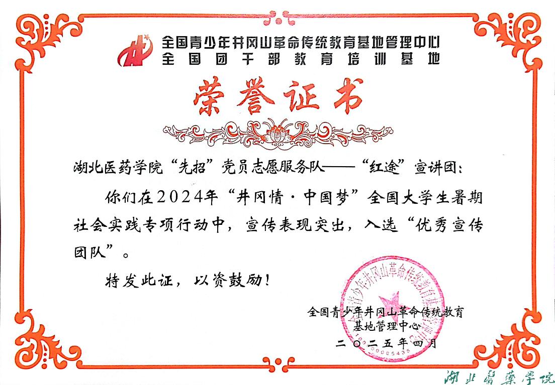 本网讯(通讯员 车婉欣 张莉莉)近日,由团中央青年发展部、全国青少年井冈山革命传统教育基地联合举办的2024年“井冈情•中国梦”全国大学生暑期社会实践专项行动公布评选结果。第二临床学院”先招“党员志愿服务队——”红途“宣讲团凭借突出表现,在全国近400支团队中脱颖而出,荣获“优秀宣传团队”荣誉称号。