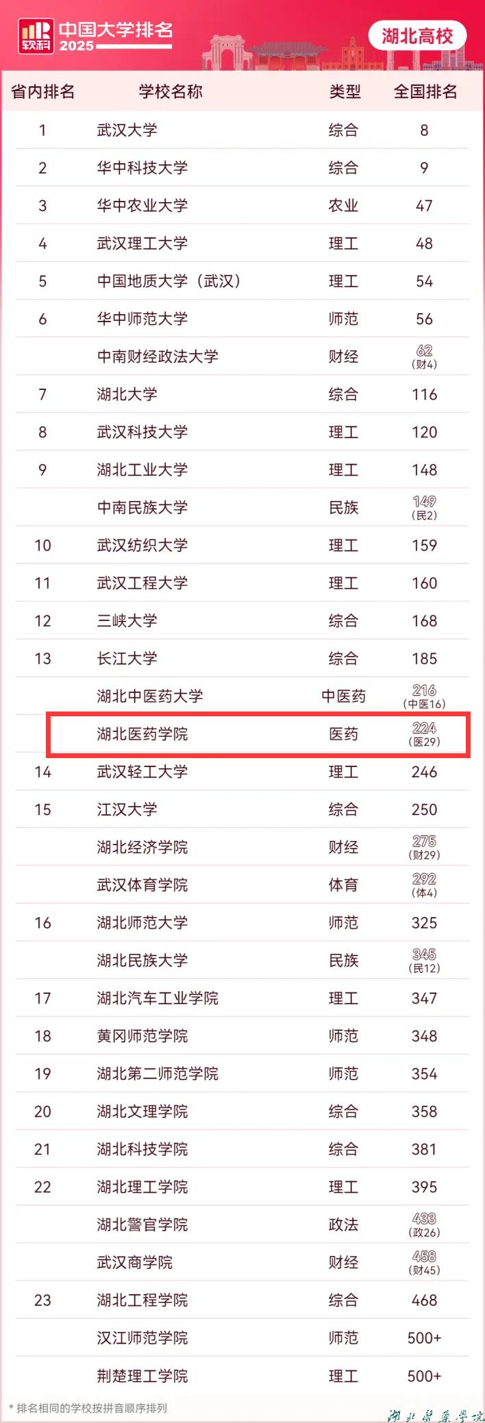 本网讯(通讯员 梁晨)4月15日,高等教育专业评价机构软科正式发布“2025软科中国大学排名”,湖北医药学院在竞争激烈的医药类大学排名中,今年取得巨大进步,位居全国大学排名第224位,较2024年上升68位,位居医药类院校排名第29位,较2024年上升10位。
