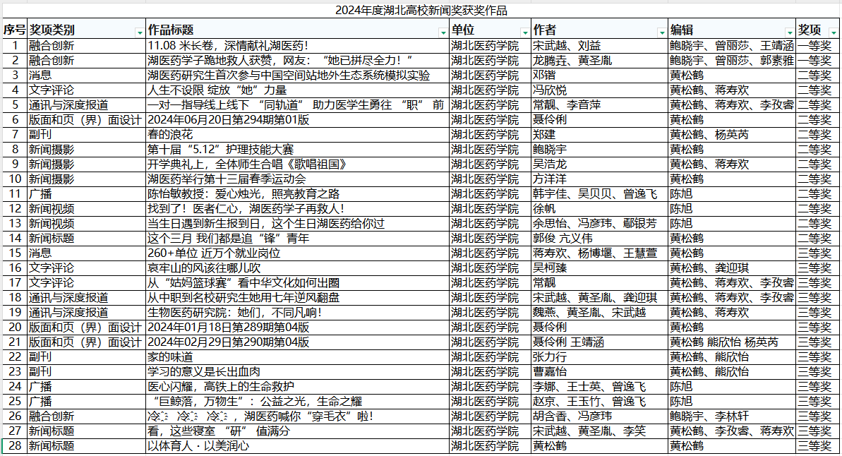 其中,宋武越、刘益合作的《11.08米长卷,深情献礼湖医药!》以及龙腾垚、黄圣胤的《湖医药学子跪地救人获赞,网友:“她已拼尽全力!”》荣获融合创新类一等奖,邓锴的消息作品《湖医药研究生首次参与中国空间站地外生态系统模拟实验》、冯欣悦的文字评论作品《人生不设限绽放“她”力量》、常靓、李音萍合作的通讯与深度报道类作品《一对一指导线上线下“同轨道” 助力医学生勇往“职”前》荣获二等奖,宋武越、黄圣胤、龚迎琪的《从中职到名校研究生她用七年逆风翻盘》以及魏燕、黄圣胤、宋武越的《生物医药研究院:她们,不同凡响!》等作品分别获得各类别二等奖。今年新增了副刊、新闻视频、新闻标题和广播类的作品评选,我校选送的作品也均取得优异成绩。