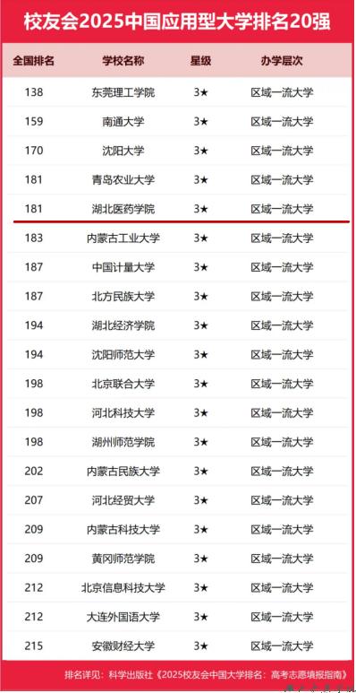 据了解,校友会2025年中国大学排名仍将中国高校划分为研究型、区域研究型、应用型和职业技能型等四种类型。榜单显示,湖北医药学院位列校友会2025年中国大学排名181位,位居校友会2025年应用型大学排名10强。
