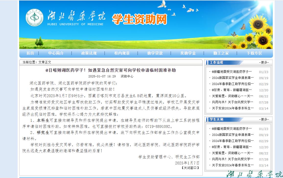 据悉,为家庭遭受自然灾害或突发意外的学生发放临时困难补助,是我校一直以来的暖心举措。学校时刻挂念受灾同学,你若有难,我必来援!湖北医药学院、湖北医药学院药护学院永远是学生最暖心的港湾和最坚强的后盾。(审核 杨金花)