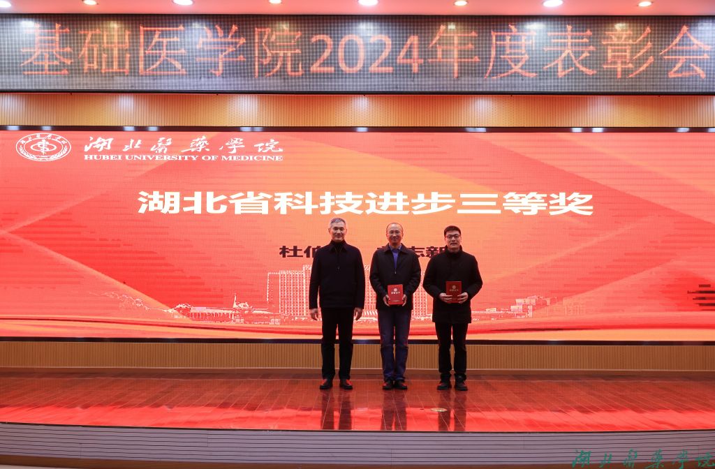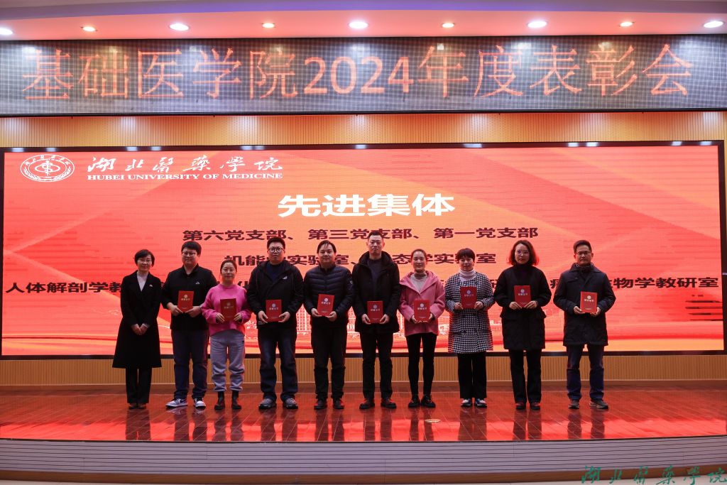 基础医学院书记赵万红宣读2024年获奖文件。校领导和学院领导为2024年学院在人才培养、教学、科研、党建、社会服务等方面表现优异的集体和个人颁发了下载凯发k8娱乐的荣誉证书。