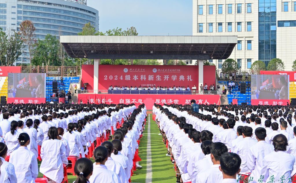 本网讯(通讯员 黄松鹤 学通社记者 陈盈盈 常靓 刘益 方洋洋 李佳仪 吴浩龙)金风送爽开学日,万里鹏程再出发。9月26日上午,湖北医药学院、湖北医药学院药护学院在田径运动场举行2024级本科新生开学典礼。全体校领导、附属医院领导、各职能部门和各学院主要负责人、新生班级辅导员及全体2024级本科新生共同见证这一重要时刻。党委常委、组织部部长张海蛟主持。