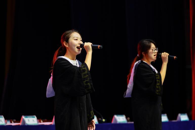 典礼伊始,暖场歌曲串烧《青春满怀 高歌起航》点燃全场师生热情。毕业生代表倾情演唱《纪念》《不要慌太阳下山有月光》《不说再见》《第一天》《青春探路者》等经典曲目,悠扬的旋律和背景屏同步播放的校园生活影像,唤起了大家对大学生活的不舍与留恋。毕业班辅导员合唱《光阴的故事》,并送出真挚而温情的祝福,让现场毕业生热泪盈眶,掌声不断。