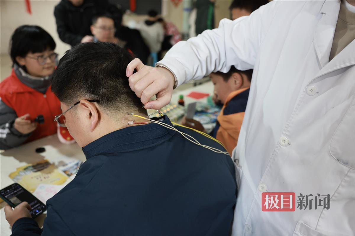 湖北医药学院将活动现场打造成了一条充满传统文化与现代趣味的文化街区。现场共开设25个特色摊位,剪纸、烙画、漆扇、投壶等非遗互动展示,康复理疗、推拿、耳穴等康复项目体验,武当中草药水晶标本、腊叶标本等自然科普展示,蛋糕、糖葫芦、襄阳牛肉面等丰富美食品尝,点歌、彩绘、心理游戏等趣味解压体验,猜灯谜、对唐诗、编织中国结等年味欣赏,退休教职工还现场写春联送春联。