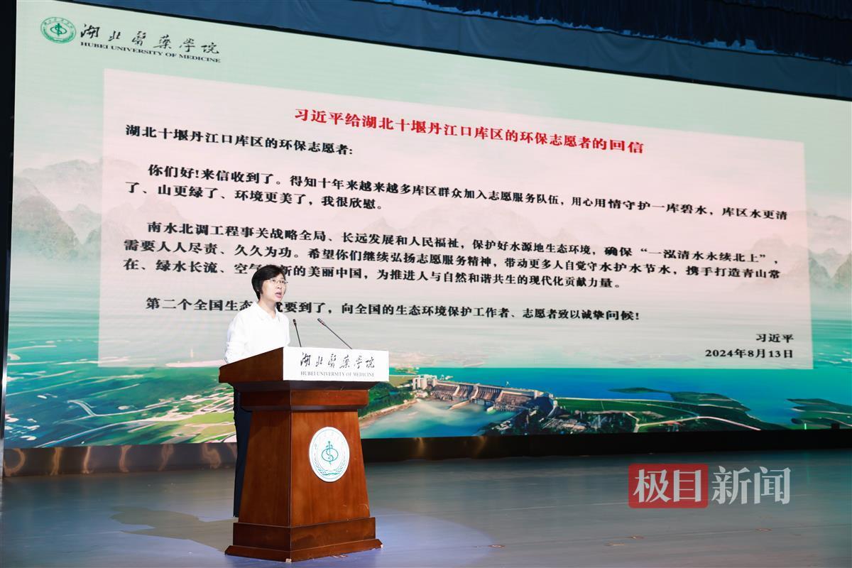 “这是我们在北京每天喝的水,更应该自己参与,把一库碧水保护好……”9月25日,在湖北医药学院学子会馆三楼,来自京堰环保联盟的志愿者李久存正在一个特别的课堂上,面向该校现场近两千名师生、线上直播近万名观众讲述北京“环保奶奶”贺玉凤的故事。这堂课正是湖北医药学院特别策划制作的“多彩中国”系列大思政课之美丽中国篇《守望·中国南水》。