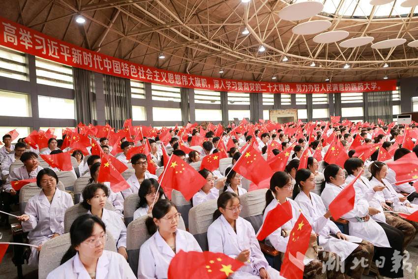 “忆峥嵘岁月,念初心不忘;承医者仁心,践报国担当……”在典礼结尾,大学生艺术团领唱歌曲《勿忘》《未来我来》,2025级全体新生挥舞旗帜,并齐声高喊“吾辈当自强”的口号,充分展现了湖医药人的精神气概。