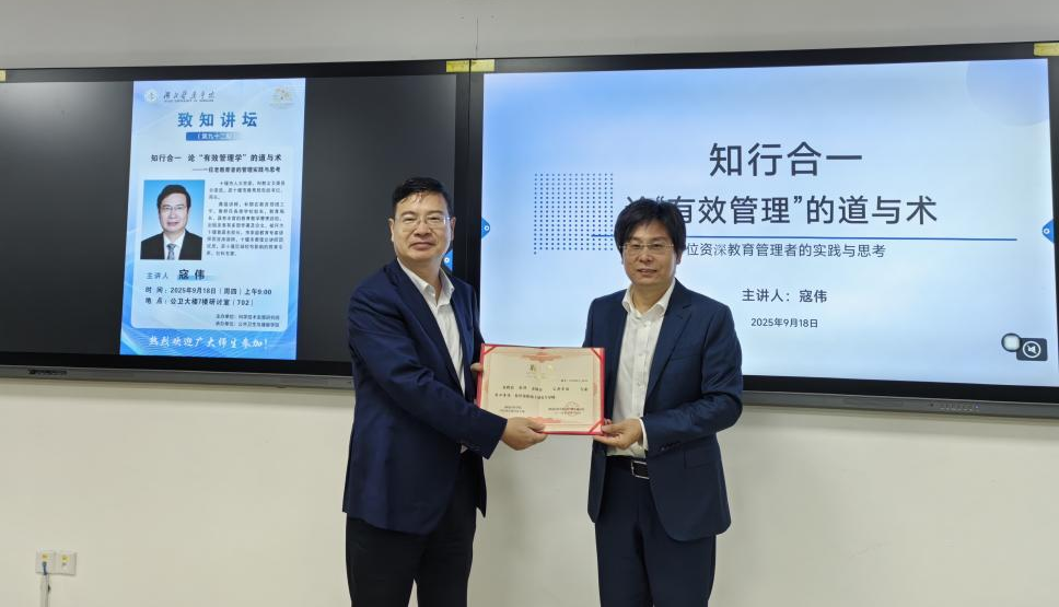 本网讯(通讯员 薛硕)为深化公共管理学科师生对管理实践的认知,助力研究生教育高质量发展,9月18日上午,公共卫生与健康学院特邀十堰市人大常委、科教文卫委员会委员,原十堰市教育局党组书记、局长、高级讲师寇伟老师莅临我院,开展主题为《知行合一 论“有效管理”的道与术》的专题讲座。公共管理学科相关教师、公共管理及图书情报专业研究生参会,活动由公共卫生与健康学院副院长邬闻文主持。
