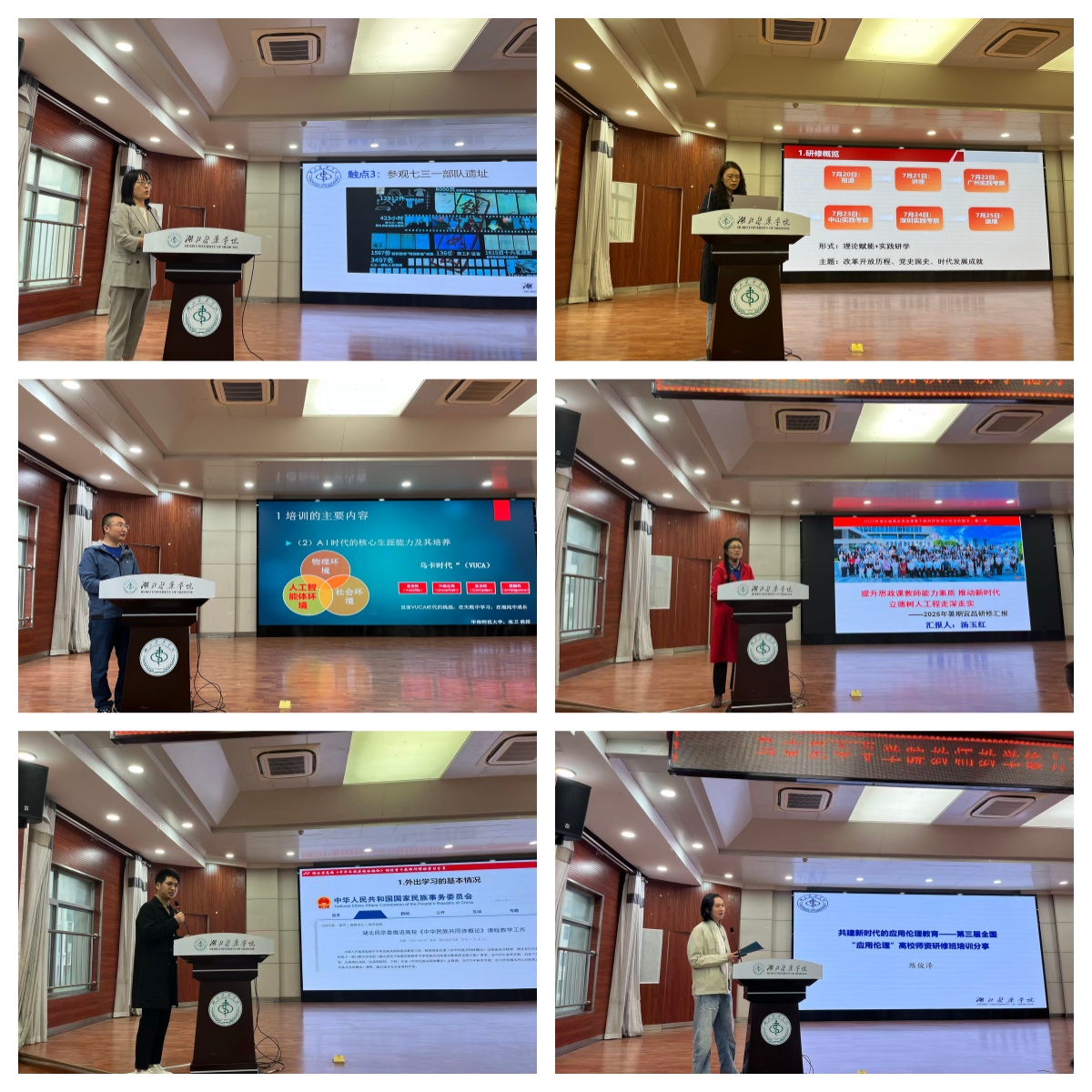 会上,参加暑期外出培训的6位教师依次展开分享,马菊华老师通过《中华医学会医学伦理学分会 2025年学术年会暨中青年学术会议巡览》,将医学伦理学与思政教育在价值引领、道德培育方面相结合进行阐述;高志婕老师以《感悟改革开放伟力,赋能思政课程建设—2025年暑期实践研修汇报》为题交流了研修心得;柴晓运老师结合当下人工智能正深刻改变教育生态,围绕如何借助 ai 赋能教与学,给现场教师带来深刻思考;汤玉红老师分享了《提升思政课教师能力素质推动新时代 立德树人工程走深走实2025年暑期宜昌研修汇报》;李成隆老师带来暑期《中华民族共同体概论》课程培训的学习经验;陈俊泽老师从《共建新时代的应用伦理教育—第三届全国“应用伦理”高校师资研修班培训分享》,将应用伦理与社会现实紧密相连,对思政课增强针对性和实效性具有重要意义。