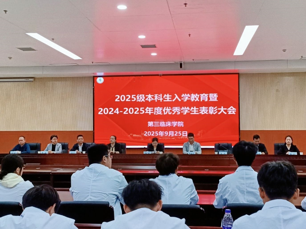 本网讯 (通讯员 张明)9月25日晚,第三临床学院在学校科教楼多功能厅举行2025级新生入学教育暨2024-2025年度优秀学生表彰大会,直属附属人民医院党委书记昝琨,第三临床学院全体院领导及2025级本科生参加大会,学院党委副书记李芹主持活动。