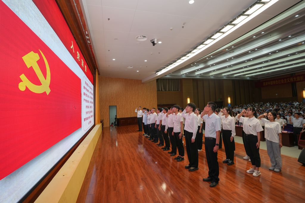 全体奏唱国歌。在火红的党旗下,校党委常委、副校长,附属太和医院党委书记罗杰带领全体党员集体重温入党誓词。