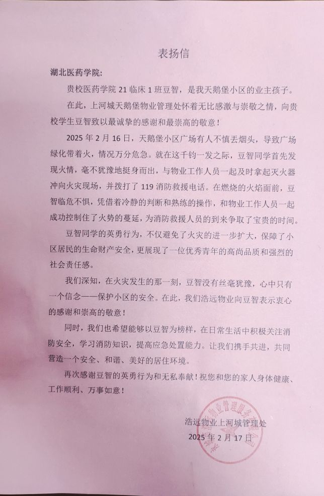本网讯(通讯员 樊婧莹 范思涵 张慧丽)近日,第一临床学院收到一封表扬信,2月16日下午,一小区中央广场的灌木丛发生起火,被三位住户及时发现。面对火情,他们临危不惧,冷静分析,迅速投入救援,其中参与救火的豆智来自2021级临床1班。