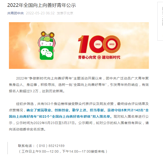 本网讯(通讯员:张慧丽、孙小虎)近日,共青团中央发布2022年“全国向上向善好青年”拟入围名单,563个身边榜样接受群众代表评议及网友点赞,确定了爱岗敬业、创新创业、勤学上进、担当奉献、崇德守信5类共计142名“全国向上向善好青年”,第一临床学院麻醉学陈子珺榜上有名。