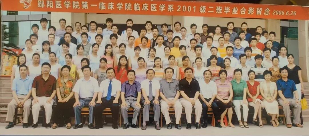 第一临床学院临床医学系2001级二班毕业合影,图中第3排右起第6位为王杏杰