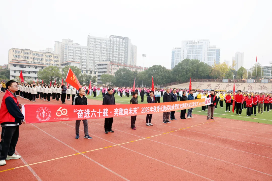 本网讯(通讯员 周一笑 钟骅)秋光正好,青春飞扬。10月29日上午,我校“奋进六十载,奔跑向未来”2025年秋季长跑运动会暨阳光体育运动启动仪式在田径运动场隆重启幕。全体在家校领导,各职能部门及学院负责人,直属附属太和医院、直属附属人民医院代表,和全校千余名师生一同用竞跑向学校六秩华诞深情献礼。