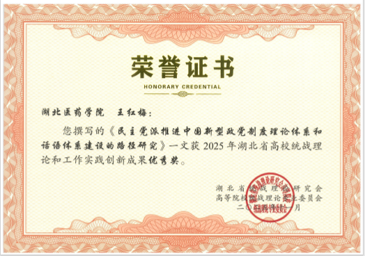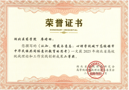 本网讯(通讯员 欧阳妮)近日,全省高校统战理论研究会第40次学术年会在荆州长江大学举行。大会表彰了2025年湖北省高校统战理论和工作实践创新优秀成果奖。我校3项成果斩获殊荣,其中药学院廖婧羽老师撰写的论文《认知、情感与意志:心理学视域下高校铸牢中华民族共同体意识教育的思考》获二等奖,药学院王红梅老师撰写的《民主党派推进中国新型政党制度理论体系和话语体系建设的路径研究》、马克思主义学院王刚老师撰写的《中华民族共同体意识融入大中小学思想政治教育》论文均获优秀奖。