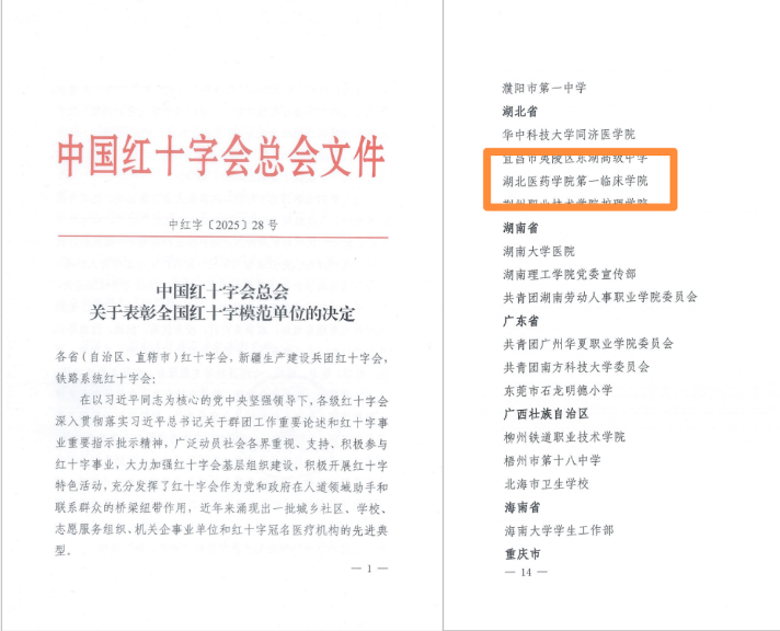 本网讯(通讯员 孙小虎 童莘轶 董浩楠)近日,中国红十字会总会印发《关于表彰全国红十字模范单位的决定》,湖北医药学院第一临床学院成功入选“全国红十字模范单位”。此次全国仅有99家学校单位、湖北省仅4家单位获此殊荣。