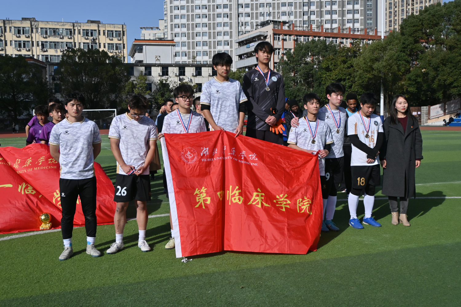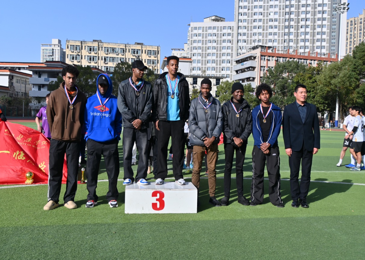 本网讯(通讯员 陈业史 许人卓)11 月 27 日下午,由校团委主办、第四临床学院、国际教育学院与校足球协会联合承办的湖北医药学院 2025 年金秋科技文化艺术节 “奋进杯” 足球赛颁奖仪式在田径场举行。校党委常委、宣传部部长陈建龙,相关学院负责人及全体获奖队员出席闭幕式。