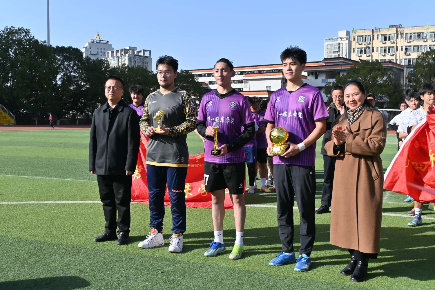 决赛落幕后,“奋进杯” 足球赛闭幕式暨颁奖仪式随即启动。据悉,本次赛事共设置三大个人奖项(最佳球员、最佳门将、最佳新人)与团体冠亚季军奖项。第四临床学院党委书记赵国新、国际教育学院副院长毛玉竹共同为个人奖项获得者颁奖;校党委常委、宣传部部长陈建龙、校团委书记邱爽、人文社会科学学院副院长朱红军为团体获奖队伍授奖。