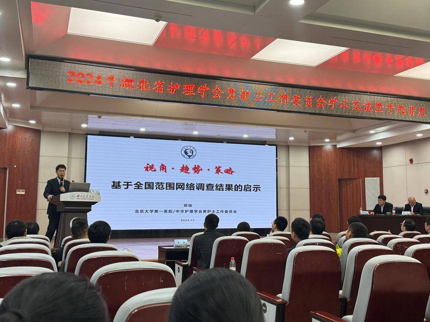 11月9日学术交流环节,中华护理学会男护士工作委员会主任委员、北京大学第一医院邓俊,以《视角 趋势 策略——基于全国范围网络调查结果的启示》为题,聚焦男护士群体,通过对比呈现2015年、2017年与2023年的相关数据,分析男护士职业发展的趋势和挑战,并基于调查结果提出促进男护士职业健康发展的策略建议。省护理学会男护士工作委员会主任委员、武汉大学中南医院重症医学科护士长丁新波等6名专家,以及湖北医药学院护理学院专任教师张振桐,围绕本次学术会议主题“专业·协同·创新·共融”,共带来8场精彩讲座。