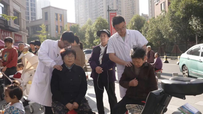 在中医理疗展位,居民们体验经络推拿等中医传统疗法。老年人对老年智能辅助设备和居家社会养老设备展位前的多功能智能化健康设备表现出了浓厚的兴趣,并亲身体验失能护理设备,感叹现代科技为居家养老带来的便利。