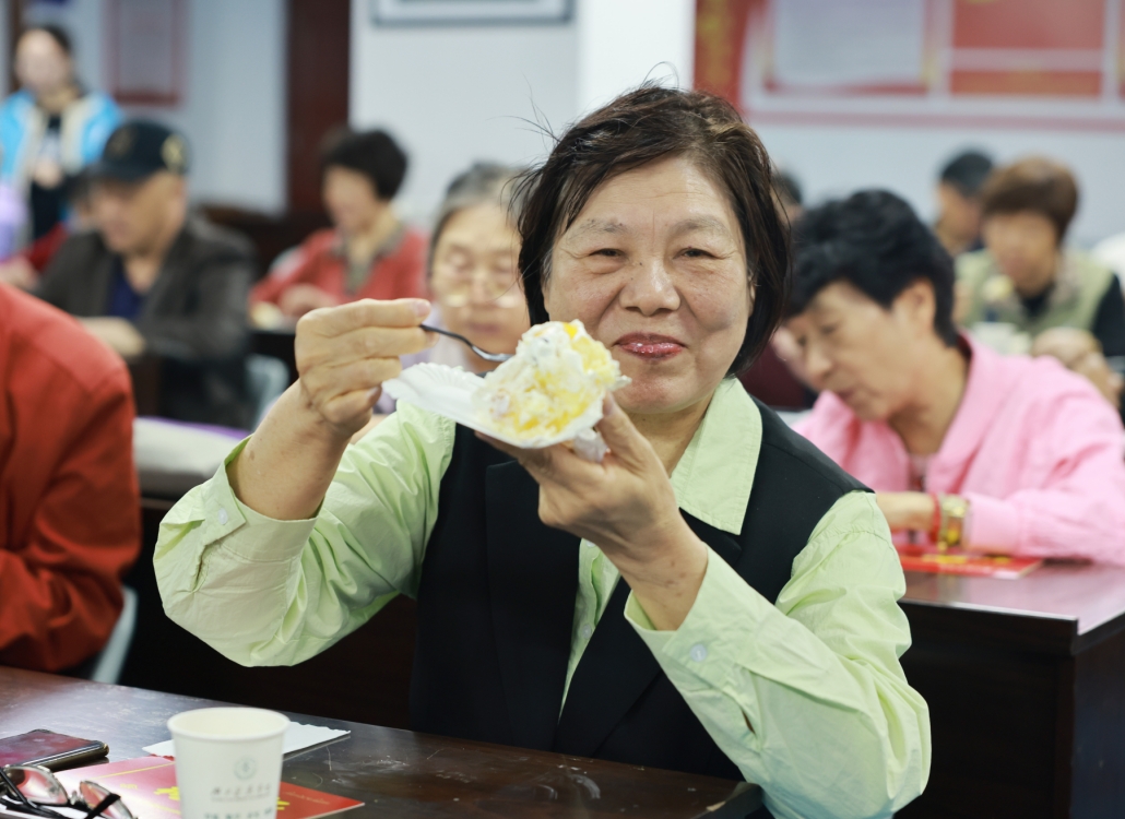 郑丹凤和老寿星代表同切蛋糕,大家一边品尝美味,一边欣赏离退休银龄葫芦丝队吹奏的《生日快乐歌》,生日会热烈而温暖,氛围感十足。