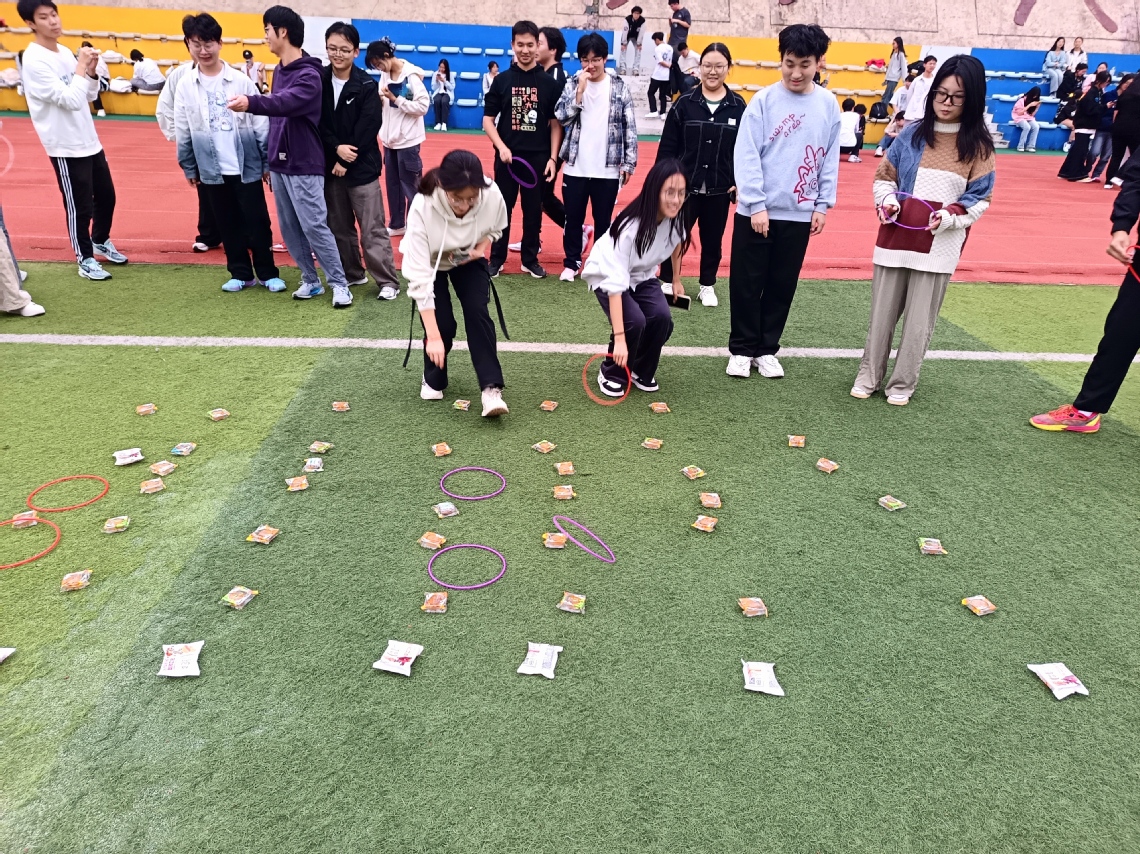 随后是趣味活动环节。趣味套圈中,随着“月饼”等套圈奖品摆放整齐,大家兴致勃勃,积极参与,认真做好每一次瞄准、投掷,套中时的欢呼声此起彼伏。“击鼓传花”活动中,将本次活动氛围推向高潮。花球在同学们手中快速传递,待鼓点骤停,拿到“花”的同学站起身,送上校庆祝福话语并高声演唱校歌,赢得满场掌声。