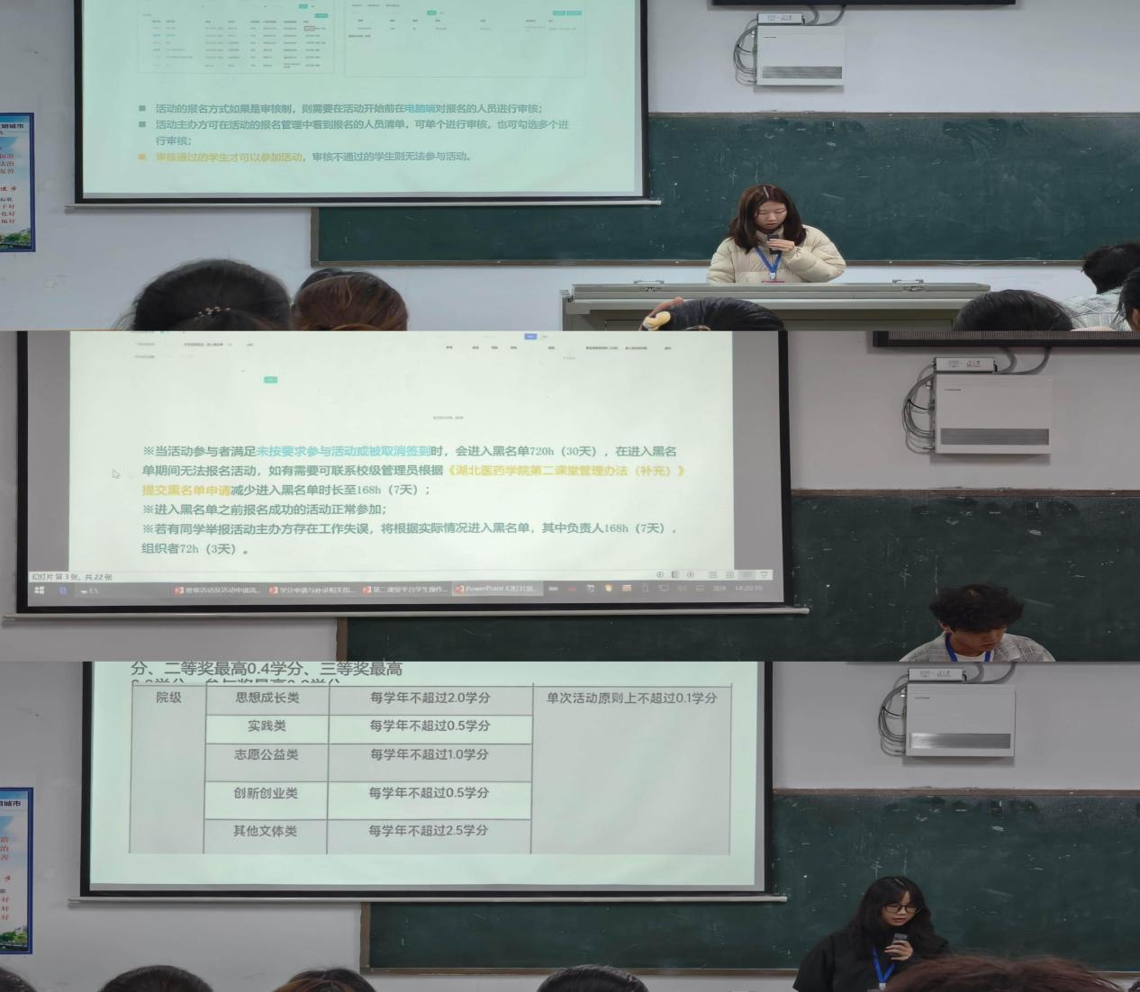 本次会议大致分为三个环节。会议伊始,分团委代表聚焦班级层面二课活动,从申请流程、申报要求、规范格式等方面,向各班级二课负责人进行细致讲解,明确活动开展“路线图”。随后,校团委代表面向各组织代表重点解读了院级活动申请流程,同时针对二课黑名单相关事宜进行了重点强调,重申二课活动的“底线”与“红线”。