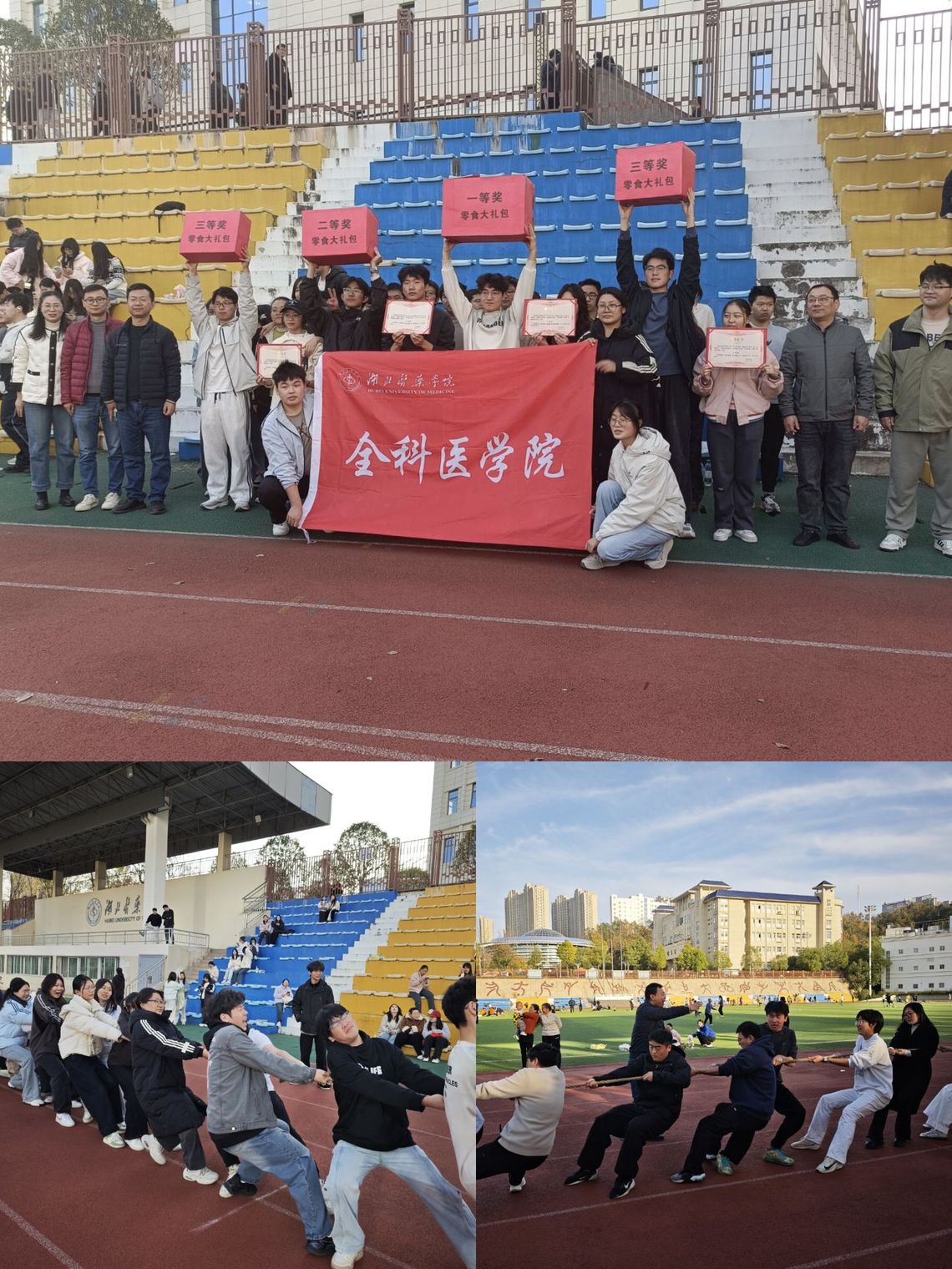 本网讯(通讯员 刘畅 蔡春林)为积极响应学校深入开展群众性体育运动的号召,11月30日下午,由全科医学院组织的“绳聚青春力量,医心共筑团结”拔河比赛半决赛与决赛在我校足球场展开。经过前期激烈角逐,2024级与2025级免费医学班的四支队伍挺进最终对决。学院党委副书记杨靖、校学工处处长陈璞、及全体专兼职辅导员悉数到场为同学们加油助威,师生同心,共绘团结拼搏的青春画卷。