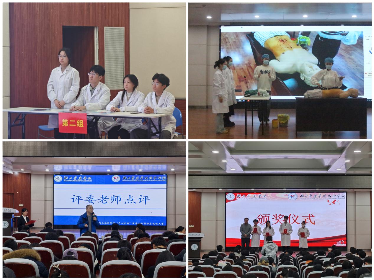 本届决赛的四支队伍从全院百余名参赛学生中选拔而来。竞赛设置医学知识问答、病例分析与临床技能操作三个环节。在知识问答环节,选手们沉着应答、思维敏捷,展现出扎实的理论基础。病例分析环节则聚焦临床思维,各队面对真实、典型的临床案例,展现了选手们整合基础知识、逻辑推理和解决实际临床问题的综合能力。临床技能操作环节,选手依次完成cpr、消毒铺巾、切开缝合、腰椎穿刺等操作,并同步解说流程与要点,体现临场实操与表达能力。