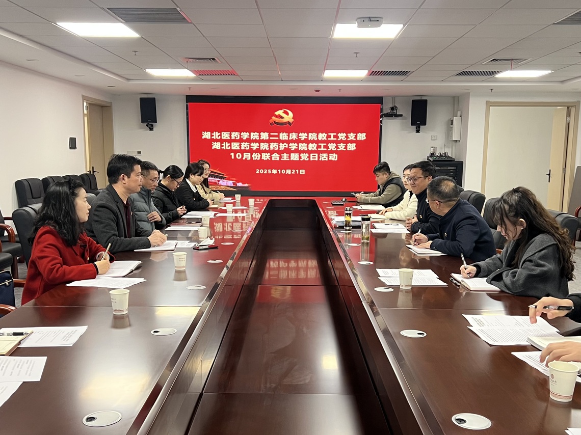 本网讯( 通讯员 毛宏灵 何金轩)10月21日下午,第二临床学院教工党支部与药护学院教工党支部在药护学院郧阳校区联合开展主题党日活动。活动由药护学院院长纪武昌主持,第二临床学院党委书记师贞明、药护学院党委书记金志雄及两院党员代表共30余人参会。